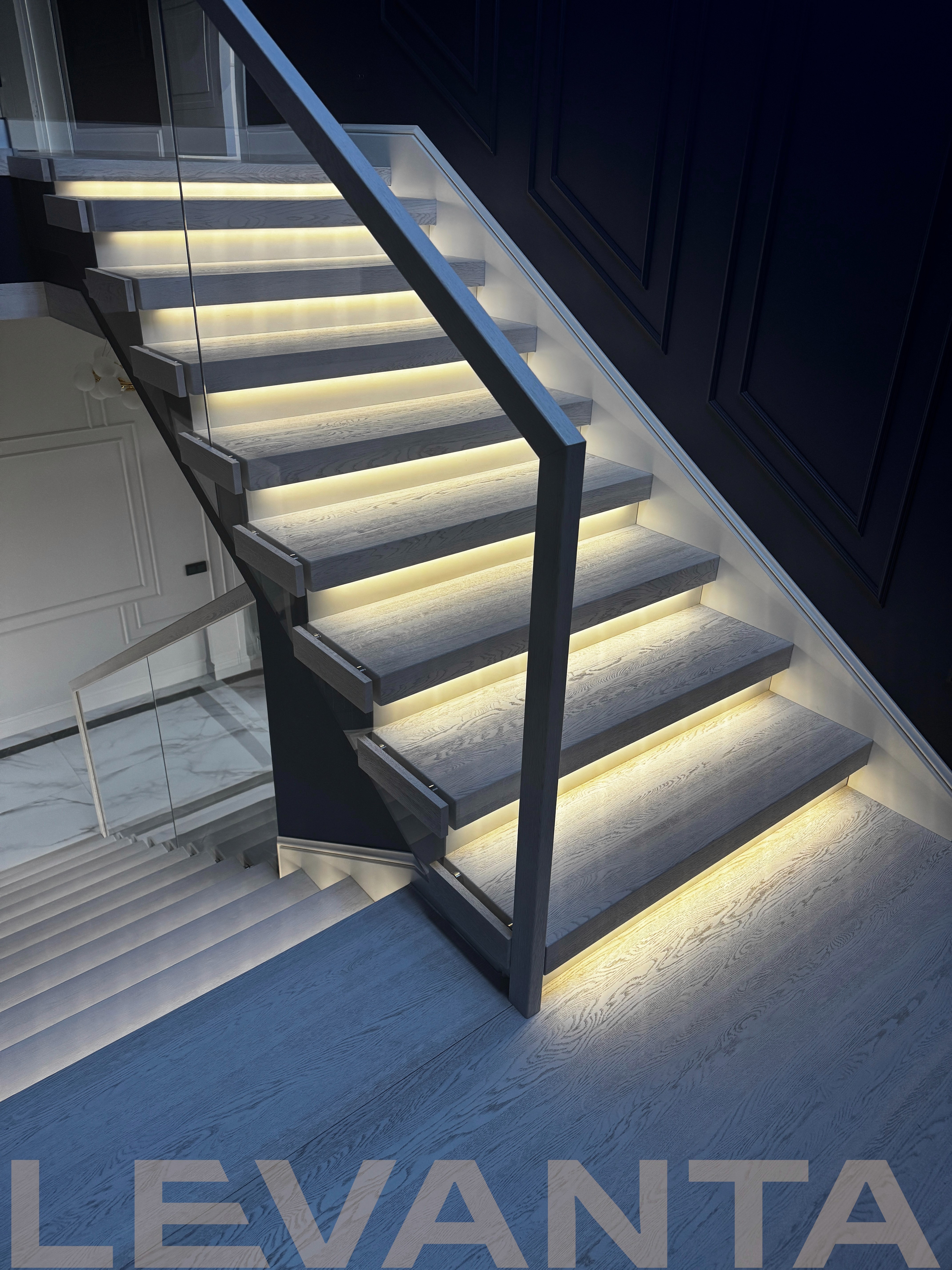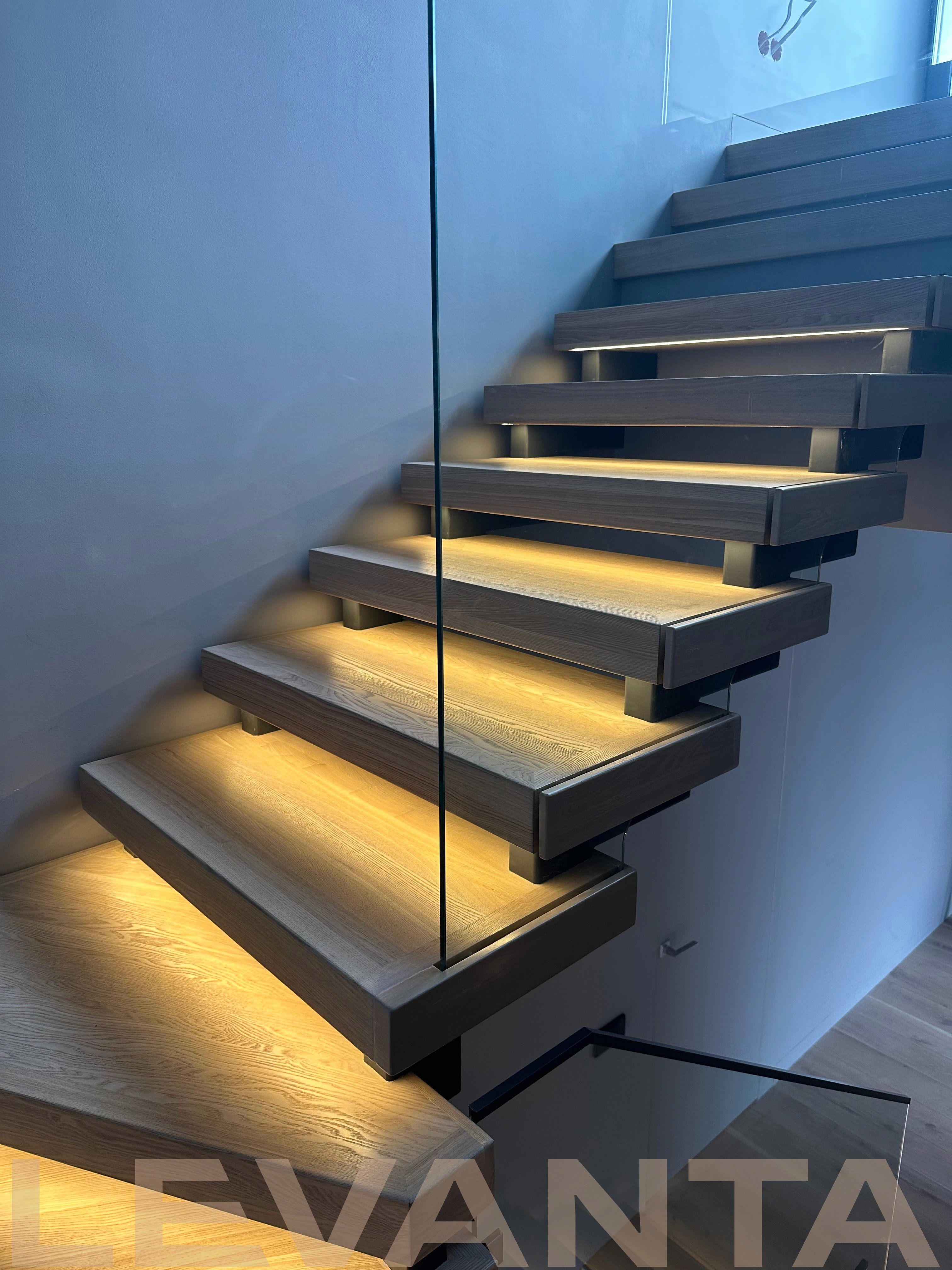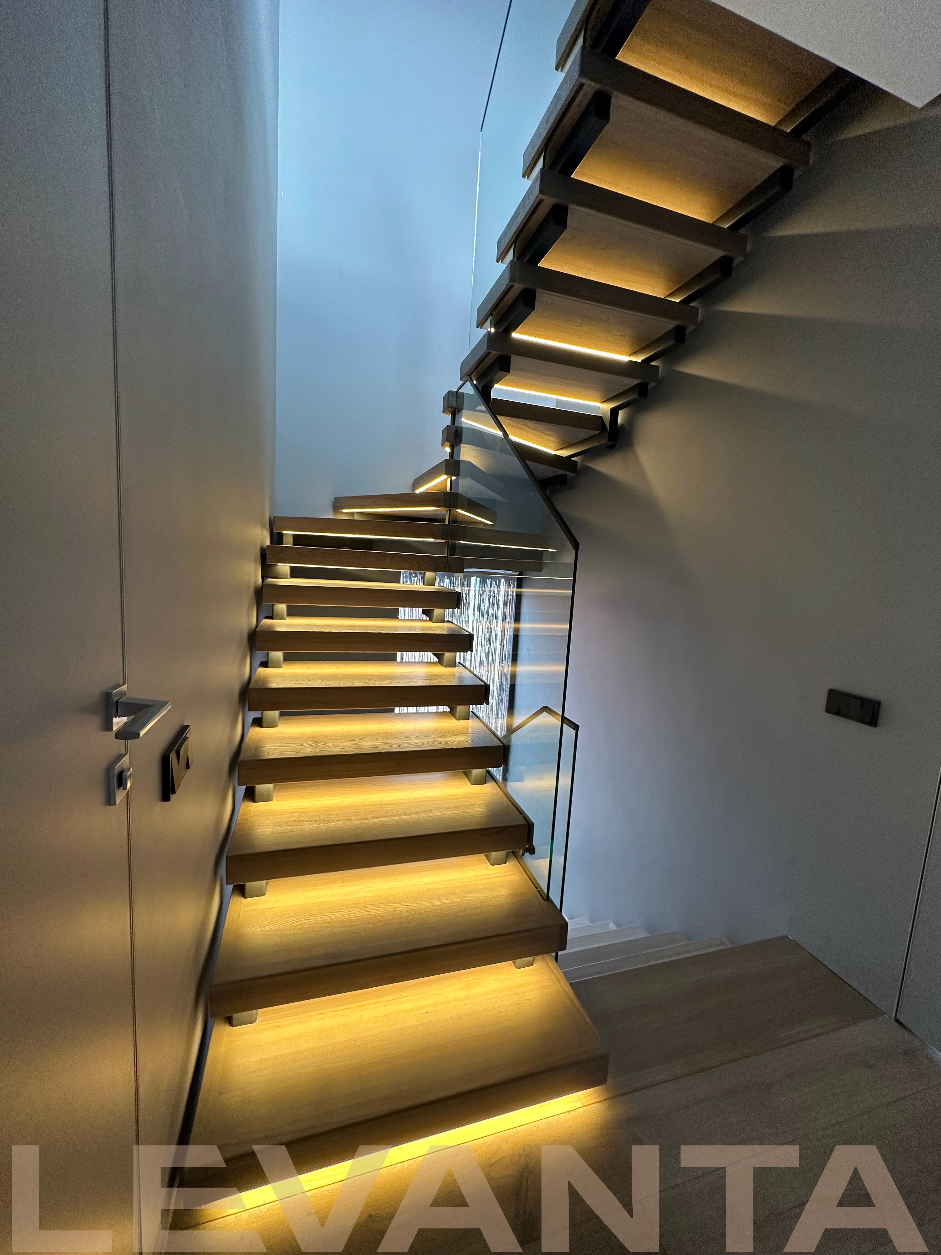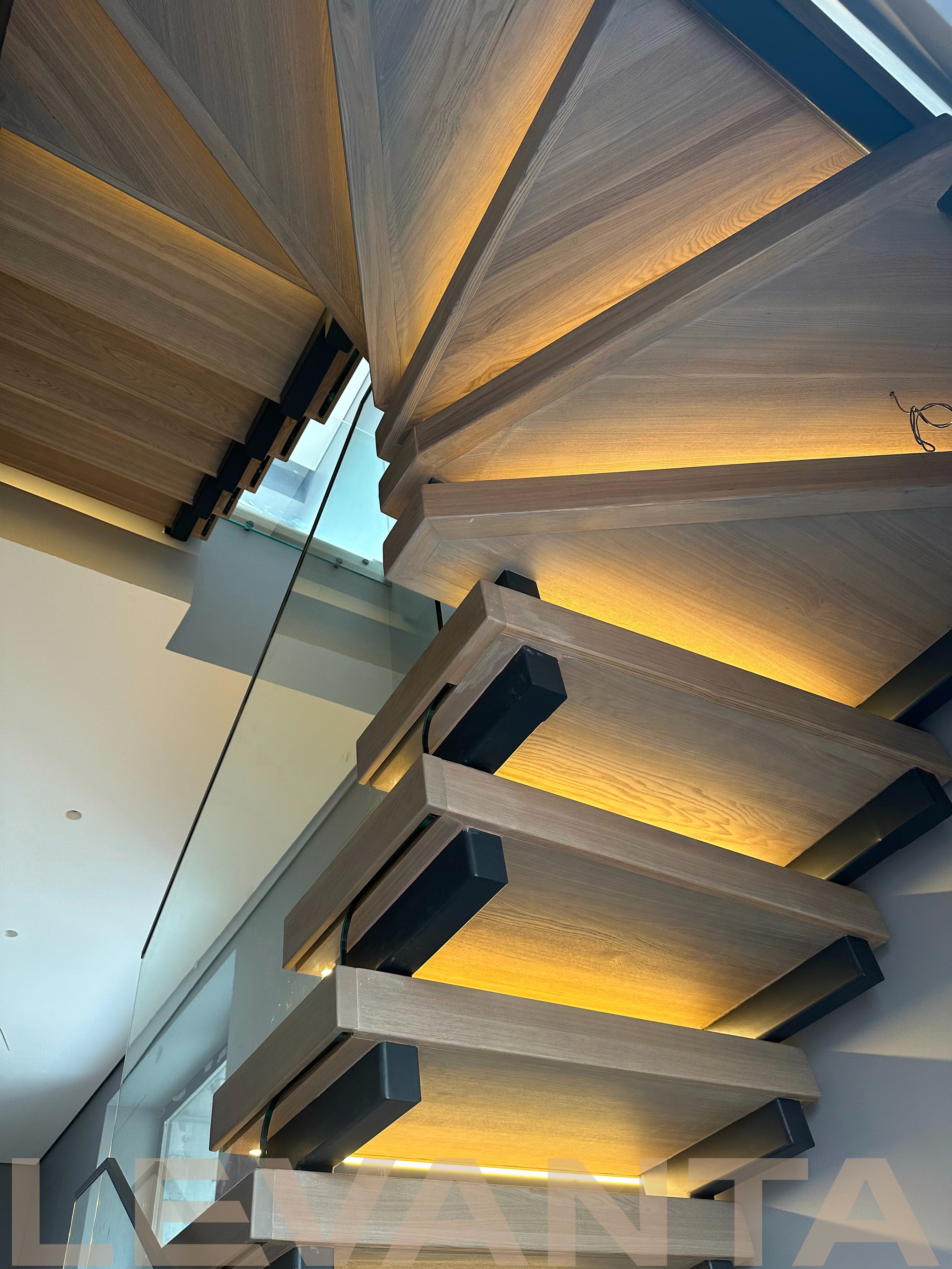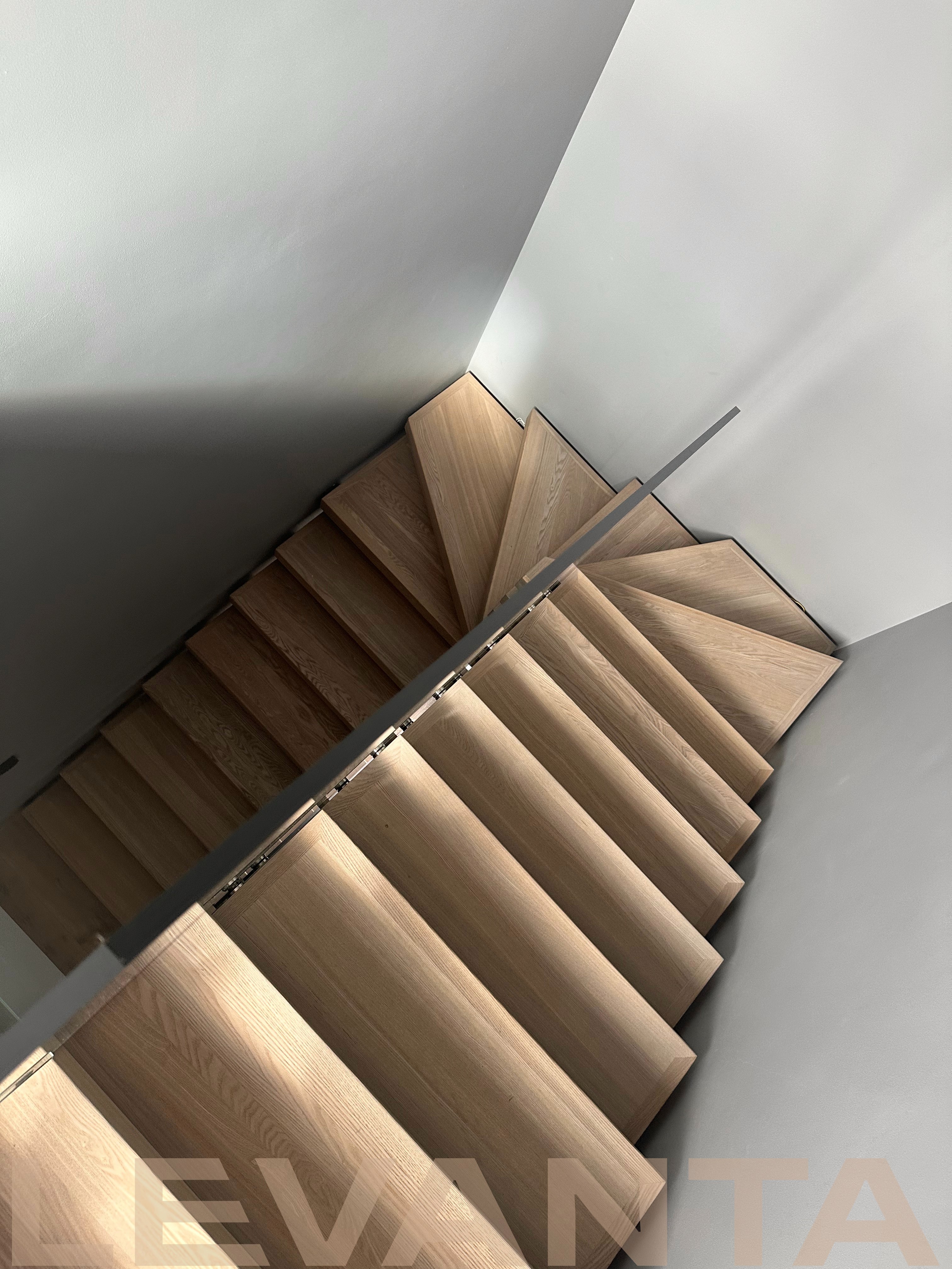 - Индивидуальность каждой детали: Нестандартные ступени без свеса создают стильный внешний вид и удобство эксплуатации. Пространство под лестницей эффективно используется благодаря подшивке и встроенной двери в кладовую комнату. Отделка оконного проема сочетается с конструктивом лестницы.
