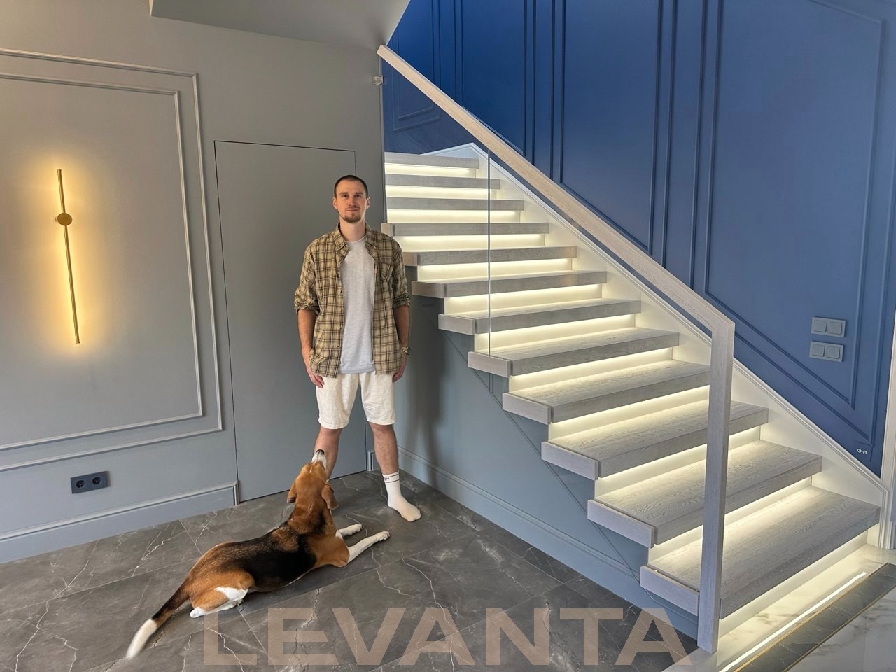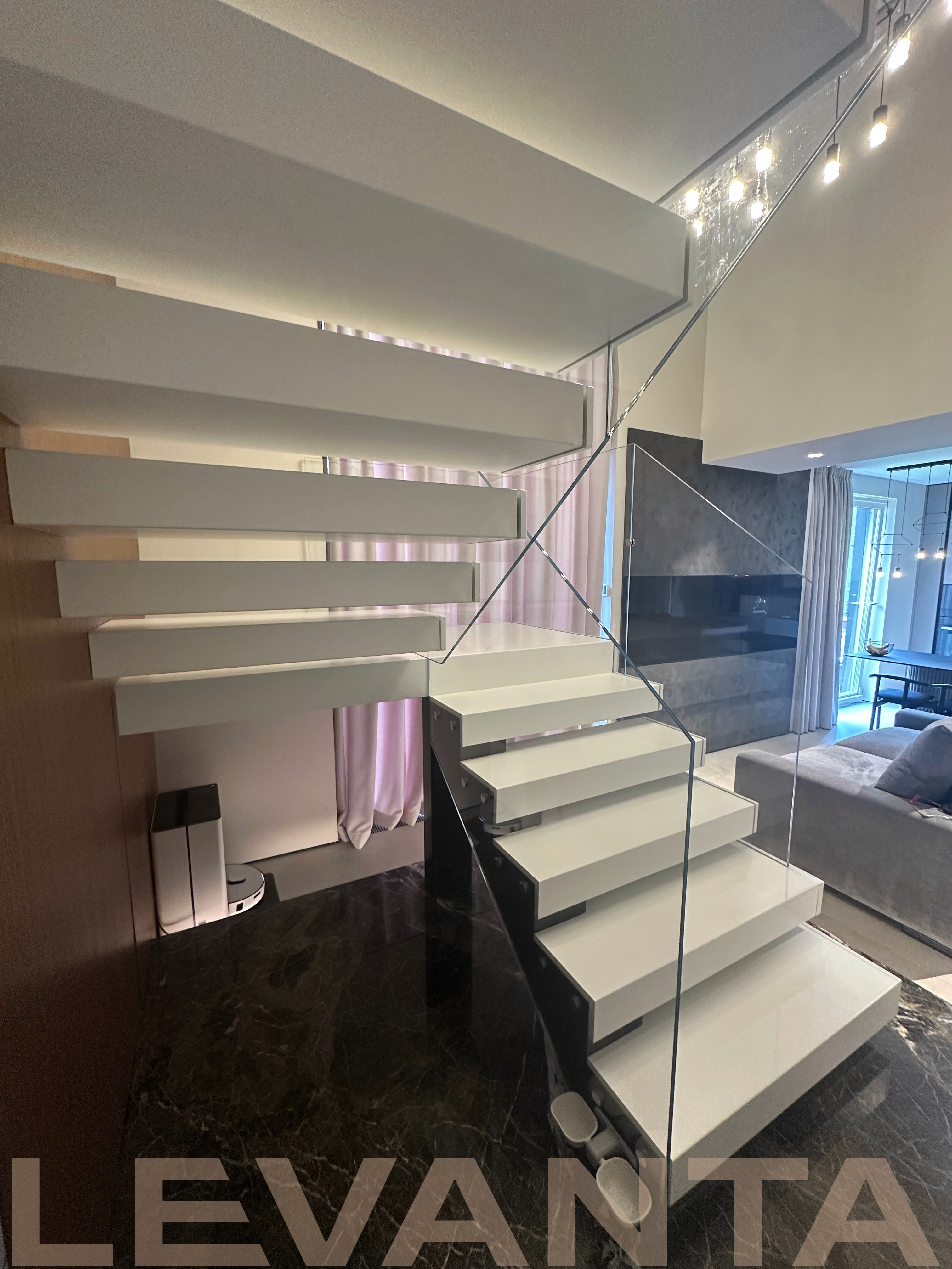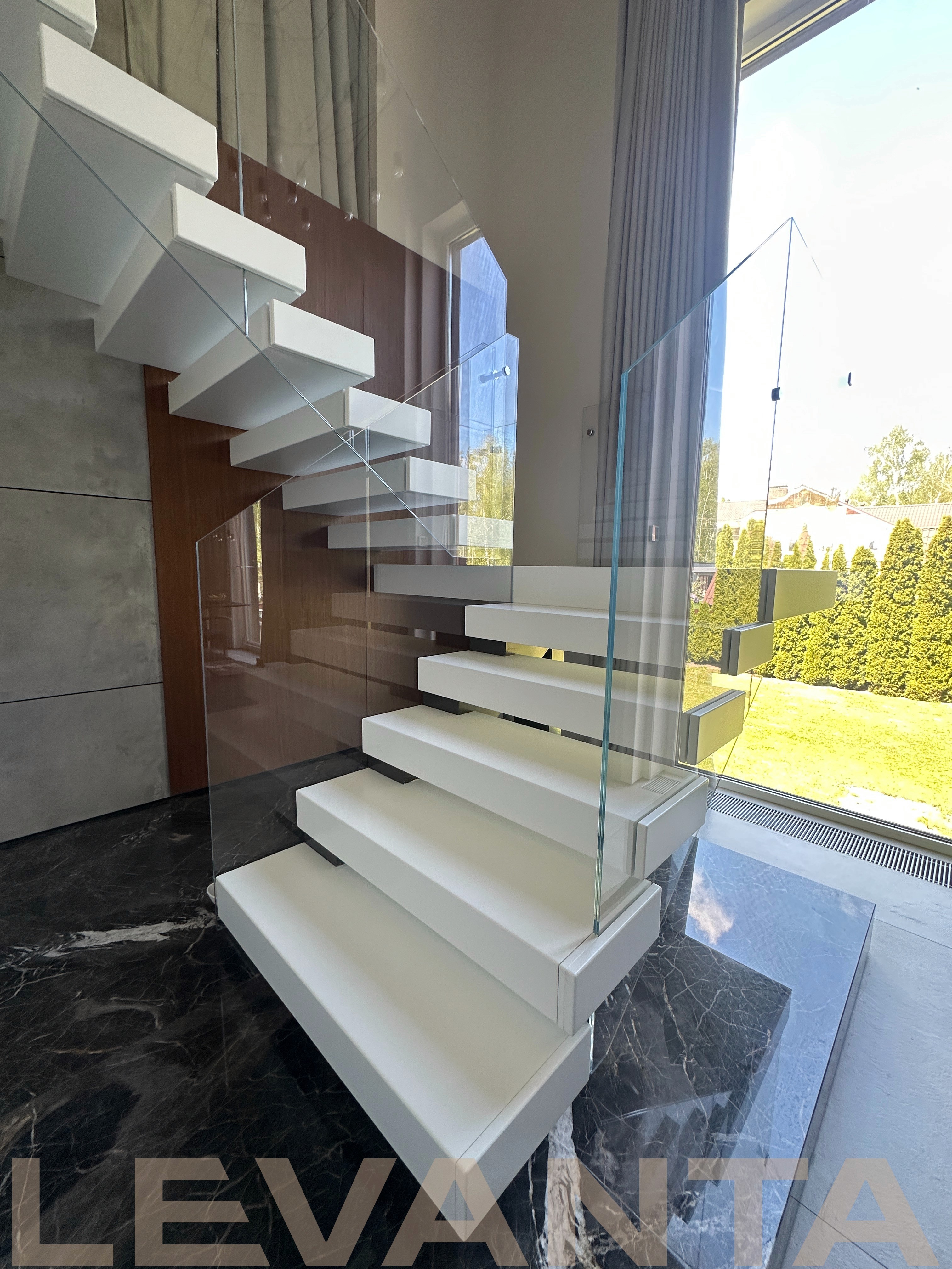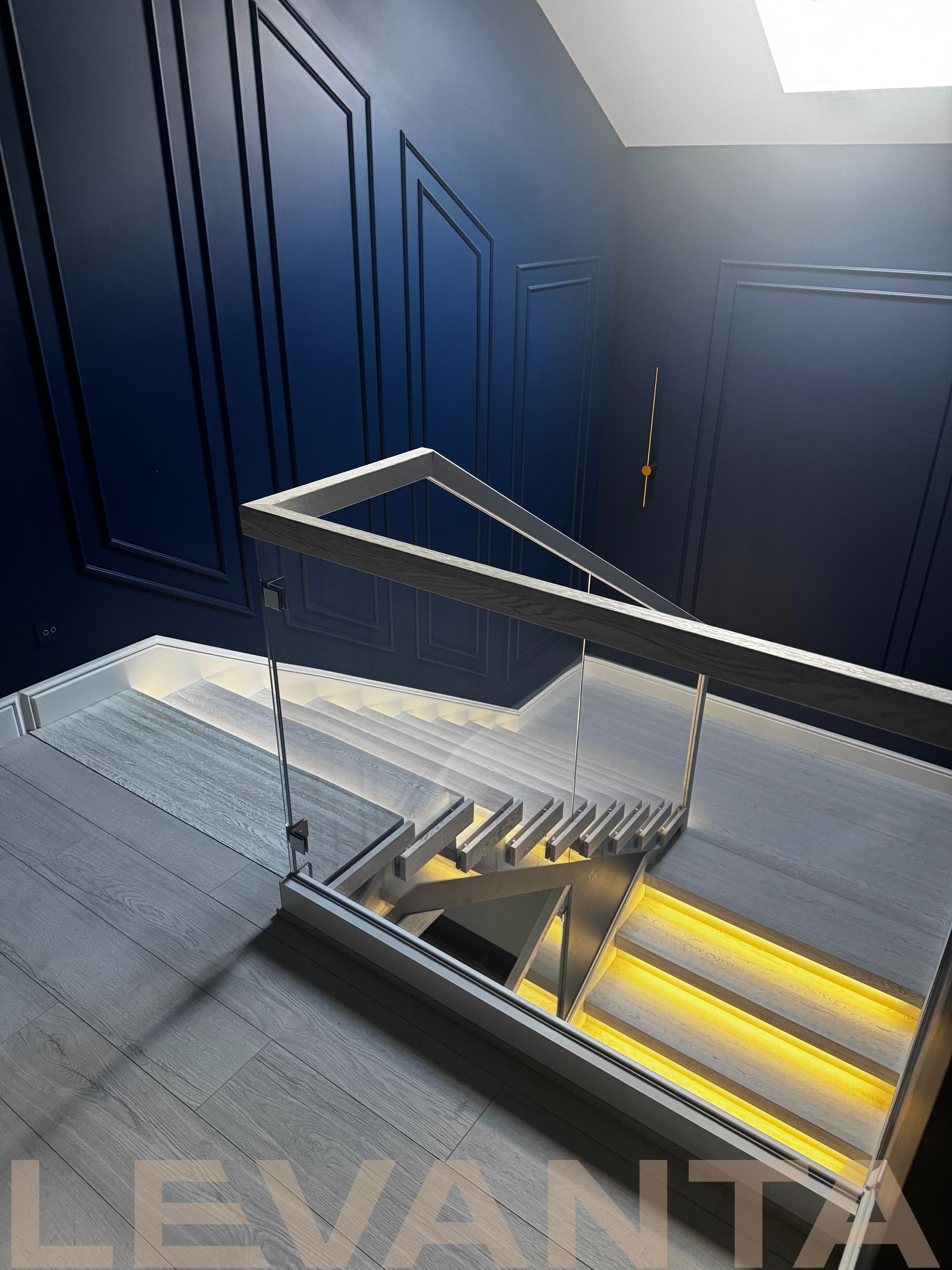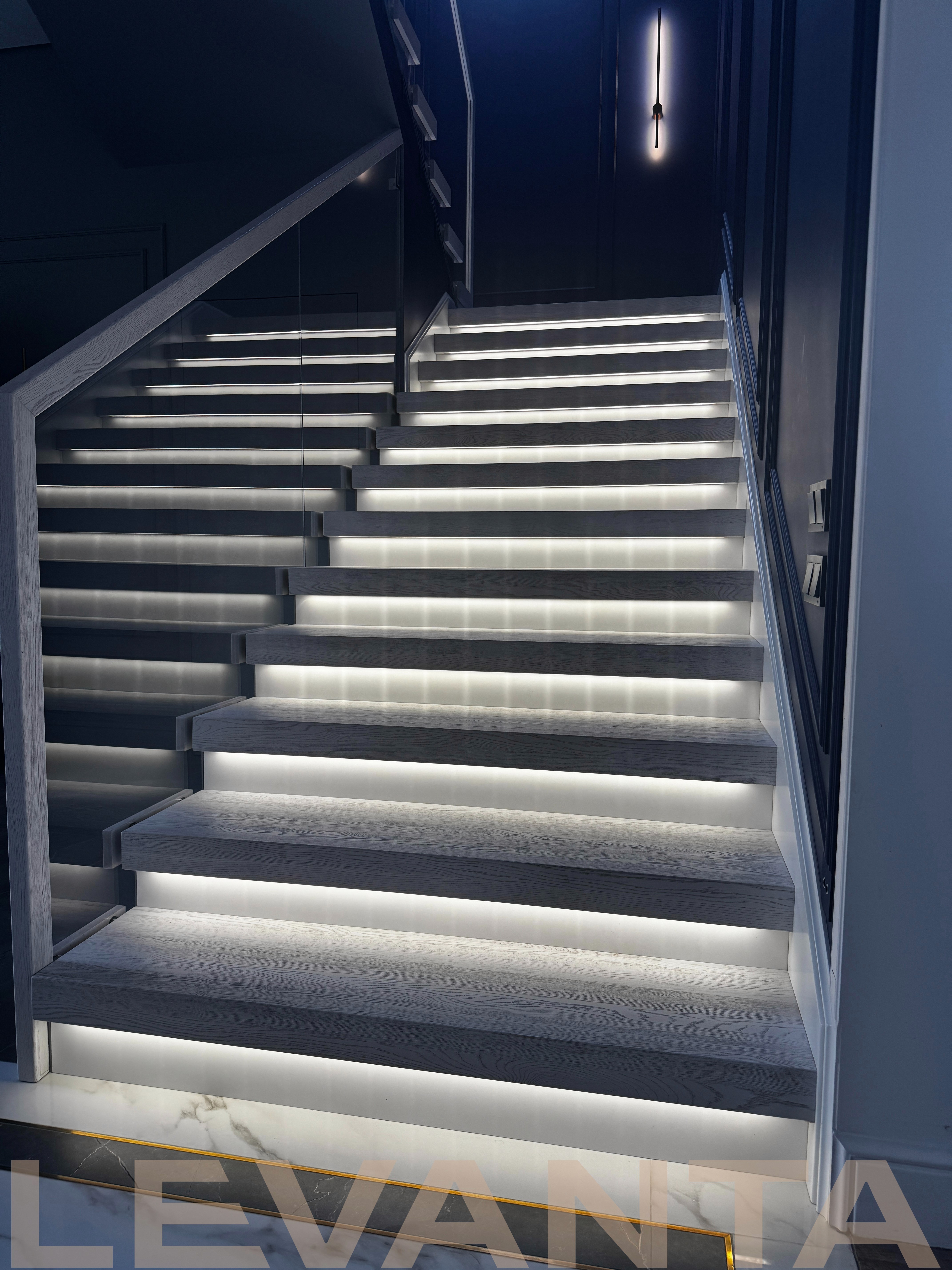- Индивидуальность каждой детали: Нестандартные ступени без свеса создают стильный внешний вид и удобство эксплуатации. Пространство под лестницей эффективно используется благодаря подшивке и встроенной двери в кладовую комнату. Отделка оконного проема сочетается с конструктивом лестницы.